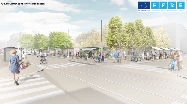 Durch eine Neustrukturierung der Platzsituation ergeben sich Möglichkeiten den Johann-Nepomuk-Vogl-Platz für die NutzerInnen, AnrainerInnen und MarkstandlerInnen sowie deren Kundinnen/Kunden sowohl gestalterisch als auch funktional aufzuwerten. Die Erichtung einer zusätzlichen Straßenbahn Haltestelle und die Initiierung eine temporären Marktes fördren einerseits regional Produktproduktionen und eine verbesserte Anbindung für das gesamte Marktgebiet und den Grünraum.